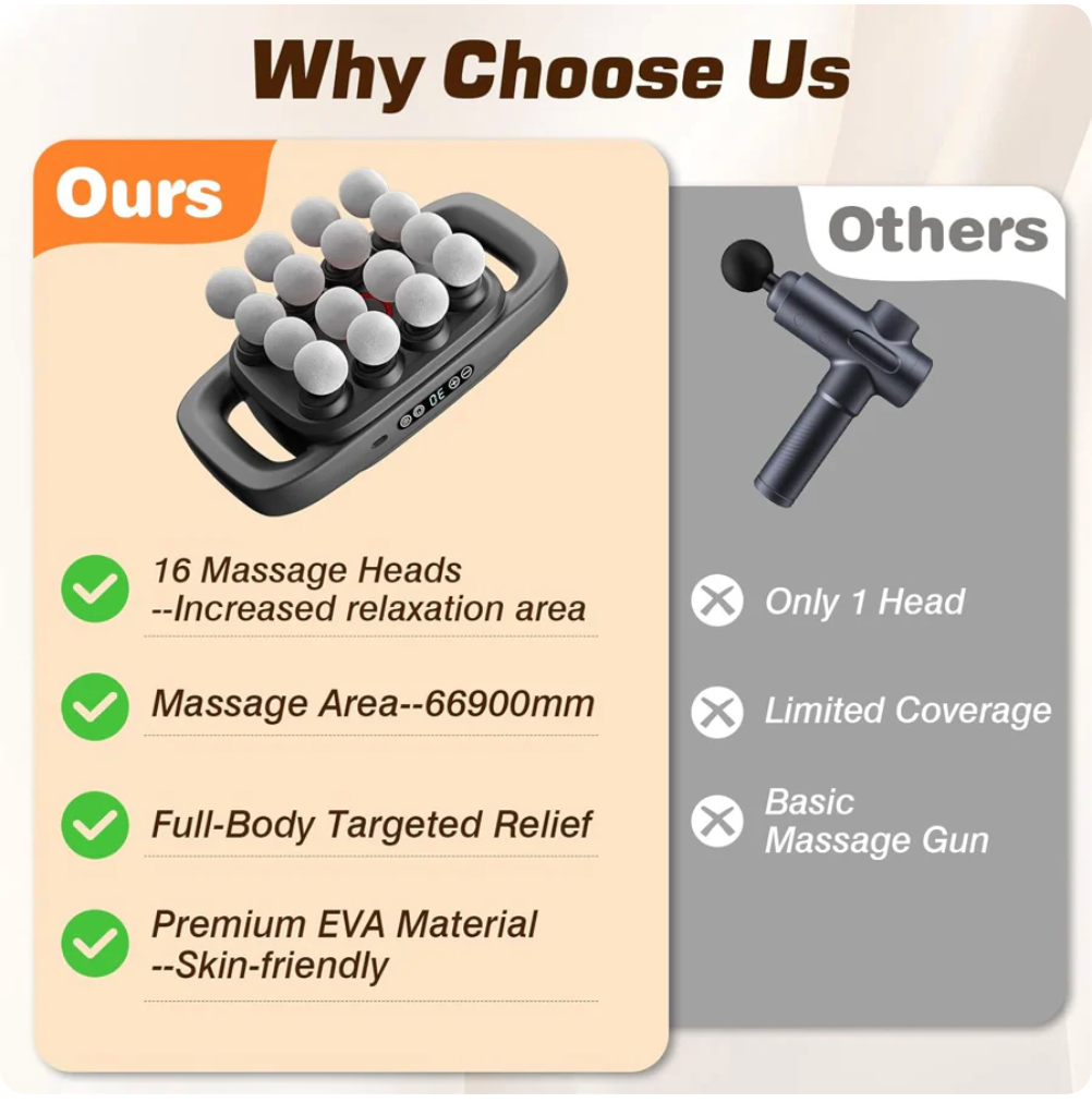Engineered with 16 massage heads, it delivers high-frequency percussion to reach deep muscle layers, easing stiffness, reducing soreness, and promoting faster recovery—all while freeing up your hands.